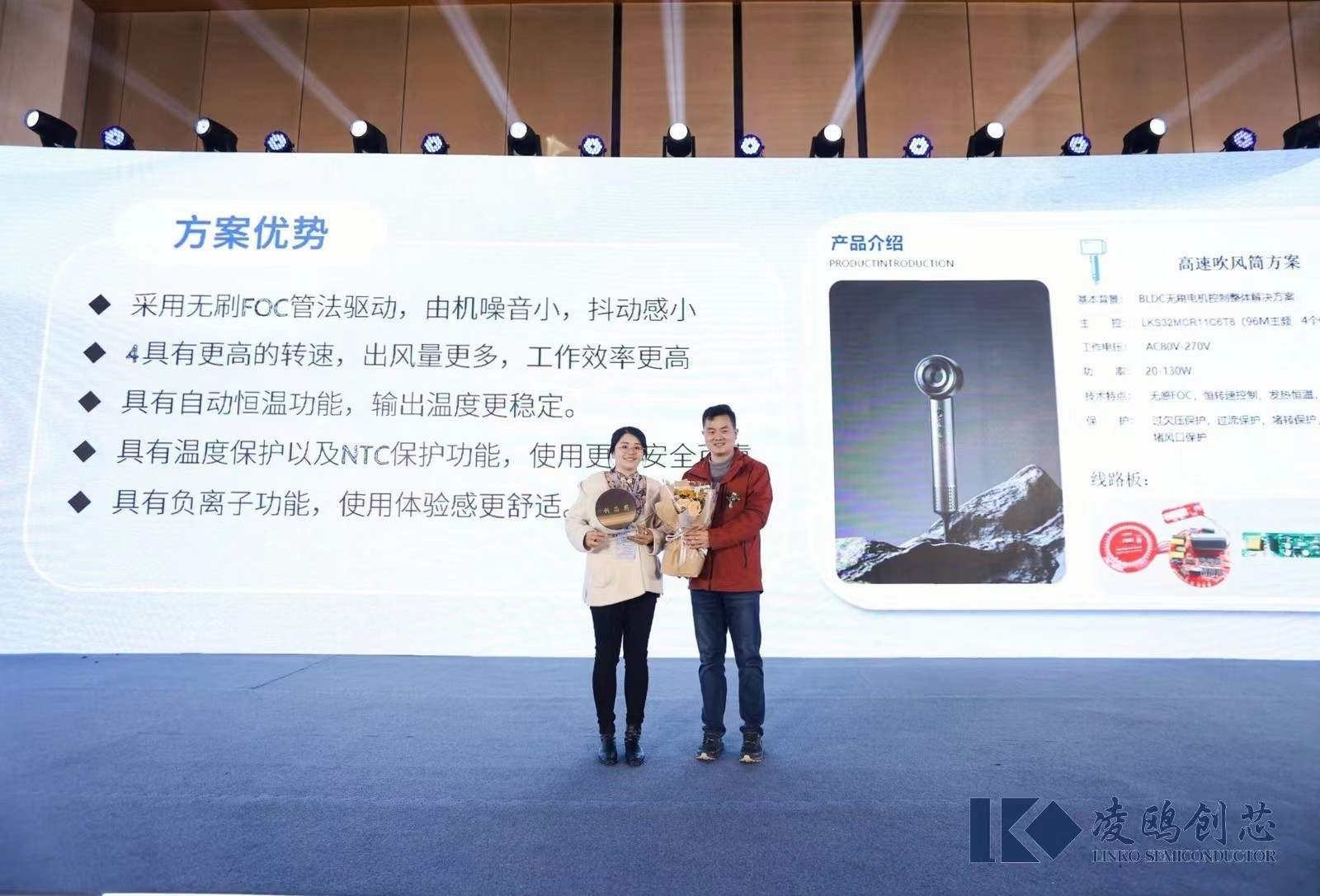 廉晨龍先生演講過后,是凌鷗創(chuàng)芯熱門應(yīng)用方案頒獎環(huán)節(jié),胡順林團(tuán)隊開發(fā)的追覓吸塵器方案獲得凌鷗獎、彭惠女士團(tuán)隊開發(fā)的徠芬吹風(fēng)筒方案獲得創(chuàng)芯獎,錢東祥先生團(tuán)隊開發(fā)的飛洋壓縮機方案、冼照明先生團(tuán)隊開發(fā)臥室風(fēng)扇方案、黃其先生團(tuán)隊開發(fā)的散熱風(fēng)機方案獲得了優(yōu)秀獎,獲獎?wù)呱吓_分享了方案設(shè)計靈感以及心路歷程。