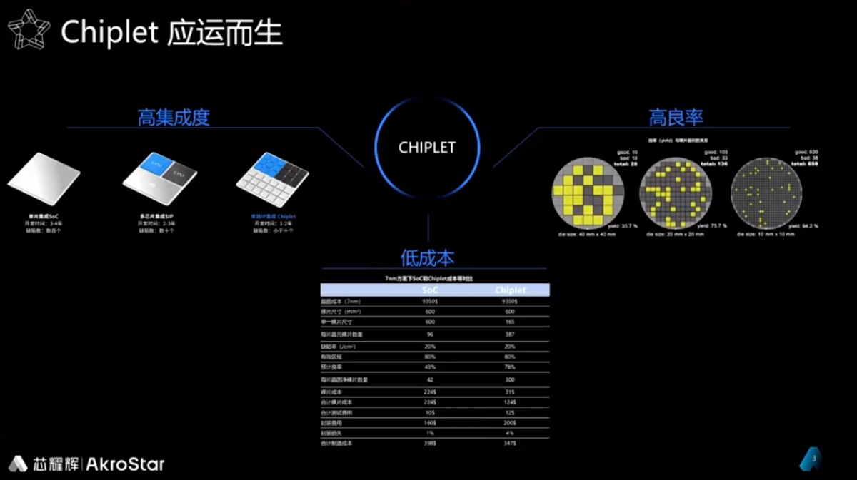 Chiplet可以提升復(fù)雜SoC芯片的良率,該方案將復(fù)雜SoC芯片分成更小的芯片。單芯片的面積越大其良率越低,它對應(yīng)的芯片制造成本也就越高,芯片設(shè)計成本也會隨著制程的演進而成本增長,切割小芯片可有效降低芯片設(shè)計成本。此外,在SoC設(shè)計中,模擬電路、大功率IO對制程并不敏感,不需要太高端的芯片制程,可將SoC中的功能模塊,劃分成單獨的Chiplet,針對功能來選擇合適的制程,從而讓芯片實現(xiàn)最小化,提高芯片的良率、降低芯片成本。