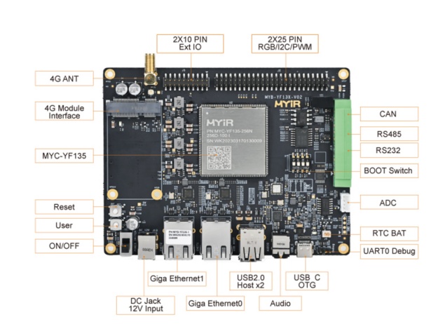 米爾STM32MP135核心板配套使用開發(fā)板,采用12V/2A直流供電,搭載了2路千兆以太網(wǎng)接口、1路USB2.0協(xié)議MINI PCIE插座的4G模塊接口、1路RGB顯示接口、1路音頻輸入輸出接口、2路USB HOST Type A、1路 USB OTG Type-C接口、1路Micro SD接口。