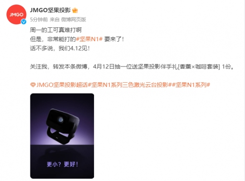 近日,JMGO投影儀在官博發(fā)布了關(guān)于新品預(yù)熱的概念海報,預(yù)告N1系列的第三款產(chǎn)品——N1投影儀將于4月12日首發(fā)上線,從海報內(nèi)容“更小?更好!”來看,堅果N1或?qū)硇峦黄?再度顛覆業(yè)界。