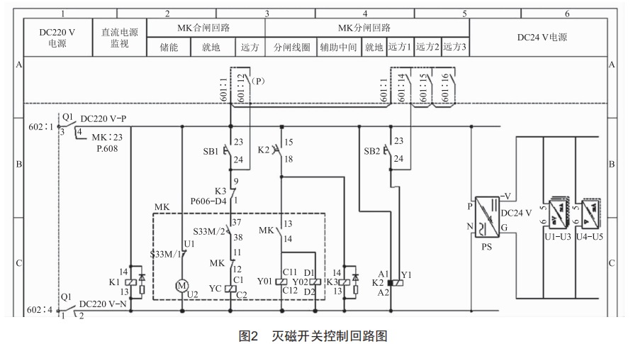 (3)檢查滅磁開關(guān)二次跳閘回路接線,通過圖2可知,分閘回路跳閘線圈Y01回路是通過接觸器MK、延時(shí)繼電器K2動(dòng)作來完成跳閘。檢修人員對延時(shí)繼電器K2進(jìn)行動(dòng)作電壓測試,Uv=9V。延時(shí)繼電器K2選型為AC/DC24~240V,最小動(dòng)作電壓應(yīng)為13.2V,不滿足動(dòng)作電壓應(yīng)為額定電源電壓的55%~70%的反措要求。