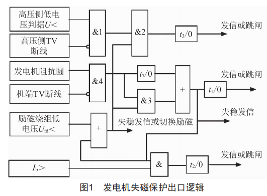 事故發(fā)生后,檢修人員對照失磁保護(hù)定值表1、保護(hù)出口邏輯圖1,對發(fā)變組保護(hù)A柜下層失磁11、12、14保護(hù)動(dòng)作及故障錄波器動(dòng)作進(jìn)行分析,對發(fā)電機(jī)轉(zhuǎn)子及相關(guān)控制回路進(jìn)行絕緣試驗(yàn)。