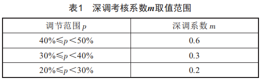 (3)調(diào)節(jié)速率考核:機(jī)組當(dāng)月歷次平均調(diào)節(jié)速率的平均值。直吹式制粉系統(tǒng)汽包爐的火電機(jī)組為每分鐘機(jī)組裝機(jī)容量的1.5%,每降低0.1%,按1分/(萬(wàn)kw·h)考核。深度調(diào)峰期間,機(jī)組平均調(diào)節(jié)速率考核分?jǐn)?shù)乘以深調(diào)考核系數(shù)m。深調(diào)考核系數(shù)m取值范圍如表1所示。