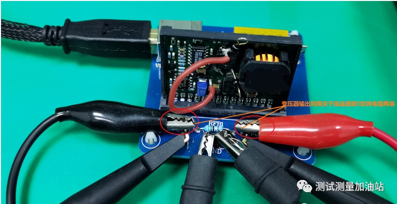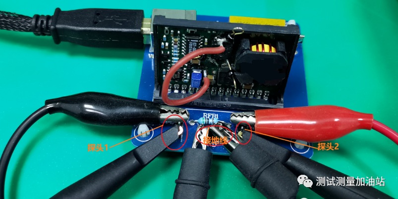 Step2:把兩根1:1或2:1電壓探頭一端連接到示波器的兩個(gè)通道,兩根探頭的另一端分別連接到注入電阻上端到地電壓和注入電阻下端到地電壓,注意接地。