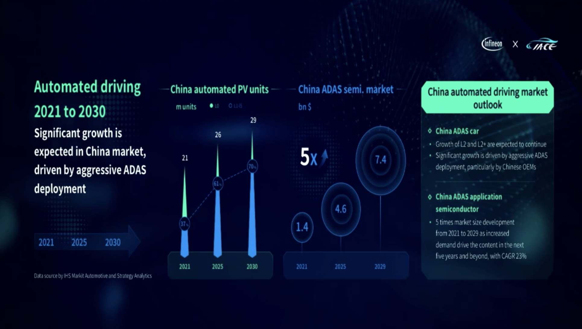 在功率半導(dǎo)體領(lǐng)域,得益于電動化趨勢,預(yù)計從2021年至2029年,在中國市場用于電動汽車動力總成的半導(dǎo)體市場規(guī)模將以約25%的復(fù)合年均增長率實現(xiàn)增長。在智能化和自動輔助駕駛領(lǐng)域,預(yù)計未來五年,在中國市場,用于ADAS應(yīng)用的半導(dǎo)體市場規(guī)模的復(fù)合年均增長率將超過20%。在網(wǎng)聯(lián)化方面,從2021年至2029年,中國域控制器市場的復(fù)合年均增長率也將超過30%。