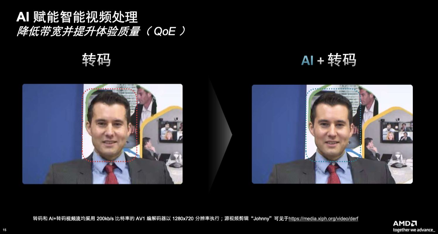在發(fā)布會現(xiàn)場AMD展示了一個(gè)晚間新聞的例子:當(dāng)畫面從主持人切換到體育賽事,再切回主持人的時(shí)候,通過Alveo MA35D上的VQ分析IP模塊,可以快速實(shí)現(xiàn)主持人的邊緣的捕捉,實(shí)現(xiàn)近乎實(shí)時(shí)的動(dòng)態(tài)處理。Sean表示,在人工智能進(jìn)行動(dòng)態(tài)調(diào)整和變化的過程中,會形成一個(gè)反饋環(huán),來確保所做的決策不是錯(cuò)誤的。通過VQ分析可以確保視頻每一幀的質(zhì)量,一旦出現(xiàn)錯(cuò)誤都可以及時(shí)調(diào)整。盡管類似的方案中已經(jīng)在傳統(tǒng)的模式中得以應(yīng)用,但通過AMD Alveo MA35D實(shí)現(xiàn)的這個(gè)方案得以在非常低時(shí)延的應(yīng)用場景中實(shí)現(xiàn)。