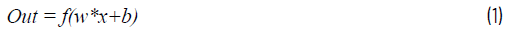 其中,f 為激活函數(shù),w為權(quán)重,x為輸入數(shù)據(jù),b為偏置。數(shù)據(jù)可以是單獨(dú)的標(biāo)量、向量或矩陣。圖1顯示了一個(gè)神經(jīng)元,它擁有三個(gè)輸入和一個(gè)激活函數(shù)ReLU。網(wǎng)絡(luò)中的神經(jīng)元總是分層排列的。