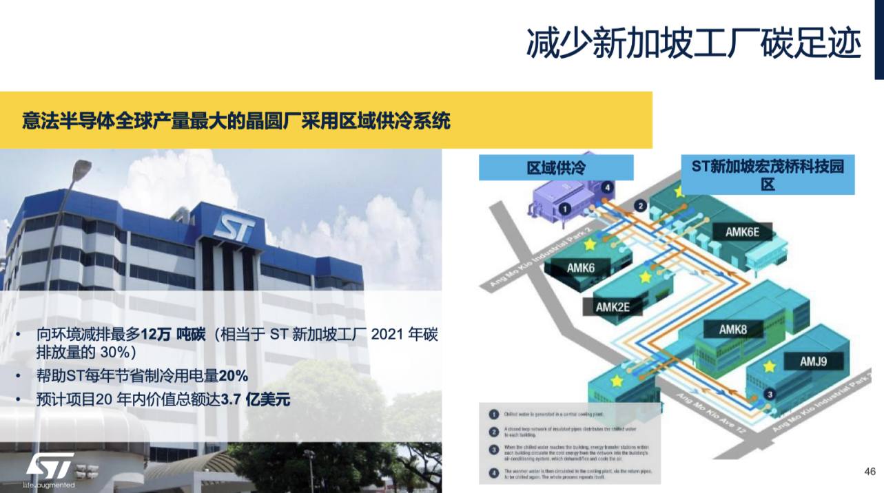 新加坡工廠是ST全球產(chǎn)量最大的晶圓廠,ST在該工廠投資3.7億美元,啟動了區(qū)域集中供冷系統(tǒng)(DCS)項目,通過管道輸配冷凍水為生產(chǎn)設備降溫,取代數(shù)百個耗電的空調系統(tǒng)。該項目落成后,新加坡工廠每年可節(jié)省制冷相關用電量20%,向環(huán)境減排量多達12萬噸碳,相當于其2021年碳排放量的30%。此外,ST大幅提升了摩洛哥庫拉封測廠的可再生電能的比例,從2020年的1%提升到了58%。