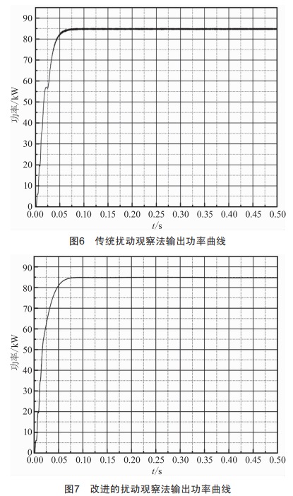 圖6、圖7為傳統(tǒng)擾動觀察法與改進的擾動觀察法的輸出功率曲線圖,二者均在0.05s左右達到最大功率點,但傳統(tǒng)擾動觀察法振蕩明顯,改進的控制策略在保證追蹤速度的同時大大提高了系統(tǒng)的穩(wěn)定性,能夠兼顧光伏系統(tǒng)運行的速度與穩(wěn)定性。