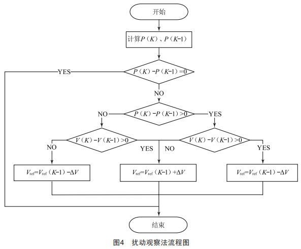 傳統(tǒng)擾動觀察法,即在一定時間內(nèi)對光伏電池的功率P和電壓v進行實時采樣,并給系統(tǒng)一個固定的擾動量Av,圖4為傳統(tǒng)擾動觀察法的流程圖,當(dāng)AP/Av=0時即達到光伏電池的最大功率點:當(dāng)AP/Av>0時,說明此時工作點在最大功率點的左側(cè),需要升高電壓:反之,AP/Av<0時,說明此時工作點在最大功率點的右側(cè),需要減小電壓。