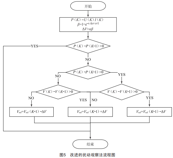 傳統(tǒng)的擾動觀察法通常全程采取固定的擾動步長來保持追蹤最大功率點的運行狀態(tài),無法同時兼顧追蹤速度和運行狀態(tài)的穩(wěn)定性。本文提出的改進的擾動觀察法,采取非固定的擾動步長來兼顧最大功率點追蹤的速度與穩(wěn)定性,具體是當(dāng)光伏系統(tǒng)啟動時采取大步長進行擾動以提高最大功率點的追蹤速度,當(dāng)臨近追蹤目標(biāo)時采取小步長以減小系統(tǒng)振蕩幅度,提高系統(tǒng)的穩(wěn)定性。由圖3可知,光伏電池P一U特性曲線的斜率不斷變化,即dP/dV在時刻變化,│dP/dV│值越小,系統(tǒng)的工作點越接近最大功率點:│dP/dV│值等于0,系統(tǒng)的工作點在最大功率點處。根據(jù)這一特性,將│dP/dV│作為步長的調(diào)整系數(shù)。取AV=a×8,a取值為0.l,圖5為改進的擾動觀察法的流程圖。
