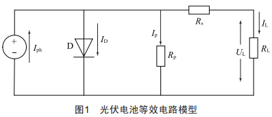 光伏電池是一個能量轉(zhuǎn)換裝置,它可以將太陽能通過電池內(nèi)部的半導(dǎo)體結(jié)構(gòu)直接轉(zhuǎn)換成可控且有規(guī)律的電能。為了在光伏系統(tǒng)的設(shè)計中更好地分析光伏電池的特性,以及與光伏控制系統(tǒng)更好地適配,達到最佳發(fā)電效果,有必要建立光伏電池的數(shù)學(xué)模型,如圖1所示。圖中的二極管D模擬光伏電池PN結(jié)內(nèi)電場的分流作用,分流之后的能量輸出到負載RL,光伏電池的內(nèi)部損耗由并聯(lián)的電阻RP和串聯(lián)的電阻Rs表示。