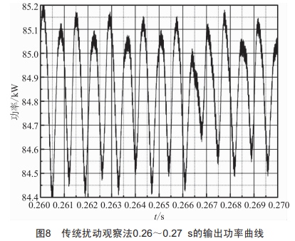 另外,對傳統(tǒng)的擾動觀察法和改進的擾動觀察法的輸出功率曲線圖截取0.26~0.27s、功率范圍為84.4~85.2kw的部分進行對比,如圖8、圖9所示。從圖8中可以看出,當(dāng)系統(tǒng)達到最大功率點時,傳統(tǒng)的擾動觀察振蕩很大,導(dǎo)致能量損耗嚴重:如圖9所示,改進的擾動觀察法顯著減小了振蕩幅度,避免了過多的能量損失。
