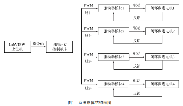 本文以驅(qū)動(dòng)閉環(huán)步進(jìn)電機(jī)為研究對(duì)象,采用LabVIEW上位機(jī)+運(yùn)動(dòng)控制卡+驅(qū)動(dòng)器模塊的控制方案進(jìn)行運(yùn)動(dòng)系統(tǒng)的設(shè)計(jì):伴隨著運(yùn)動(dòng)的多元化,多軸控制得到進(jìn)一步關(guān)注,故系統(tǒng)設(shè)計(jì)從四軸控制的角度出發(fā)。系統(tǒng)總體結(jié)構(gòu)框圖如圖1所示,該運(yùn)動(dòng)控制系統(tǒng)主要分為硬件和軟件兩部分,硬件部分主要由工控機(jī)、四軸運(yùn)動(dòng)控制卡、驅(qū)動(dòng)器模塊、閉環(huán)步進(jìn)電機(jī)構(gòu)成,其中工控機(jī)主要用于LabVIEW上位機(jī)軟件的硬件環(huán)境,四軸運(yùn)動(dòng)控制卡通過(guò)驅(qū)動(dòng)器模塊進(jìn)行閉環(huán)步進(jìn)電機(jī)的控制管理,同時(shí)閉環(huán)步進(jìn)電機(jī)自帶的編碼器向驅(qū)動(dòng)器模塊實(shí)時(shí)反饋位置信息,驅(qū)動(dòng)器模塊依據(jù)反饋信息進(jìn)行輸出指令調(diào)節(jié),提高電機(jī)運(yùn)轉(zhuǎn)精度。