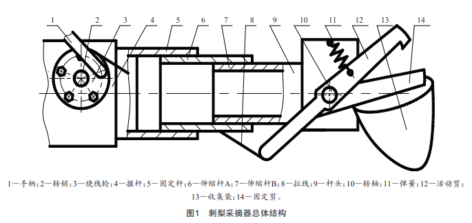 采摘刺梨作業(yè)前,依據(jù)需采摘刺梨與人手間的距離,調(diào)節(jié)伸縮桿A(6)和伸縮桿B(7)的伸出長度來獲得一段適宜的桿長。此時(shí),繞線輪(3)繞轉(zhuǎn)銷(2)轉(zhuǎn)動(dòng)來拉緊或放松拉線(8),使活動(dòng)剪(12)與固定剪(14)間呈一定角度:隨后,把手柄(1)以一定方位安裝到繞線輪(3)上的某一正六邊形孔內(nèi),以待進(jìn)行刺梨采摘。