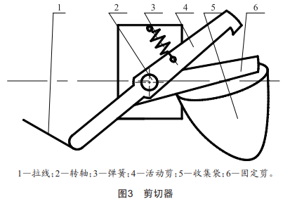 本文設(shè)計(jì)的剪切器總體結(jié)構(gòu)如圖3所示,其主要由拉線(1)、轉(zhuǎn)軸(2)、彈簧(3)、活動(dòng)剪(4)和固定剪(6)等組成。活動(dòng)剪(4)安裝在轉(zhuǎn)軸(2)上,可轉(zhuǎn)動(dòng),其一端連接拉線(1),另一端連接拉力彈簧(3),活動(dòng)剪(4)全長120mm,與固定剪(6)相配的剪刀刃口長度50mm。為使采摘剪切刺梨時(shí)更加省力,彈簧(3)安裝在離轉(zhuǎn)軸(2)中心20mm處,拉線(1)固定在離轉(zhuǎn)軸(2)中心60mm處。同時(shí),因刺梨的果柄較短,為4~8mm不等,因此活動(dòng)剪(4)與固定剪(6)在剪切刃口段的總厚度不超過4mm,以保證它們能夠順利深入刺梨與結(jié)刺梨的樹枝之間,完成對刺梨果柄的順利剪切。收集袋(5)的開口沿邊離固定剪(5)下邊緣30mm,大于刺梨半徑,即收集袋(5)不會(huì)阻礙固定剪(6)伸入刺梨果柄處。