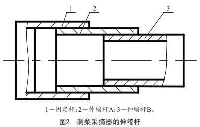 因刺梨樹枝丫呈"籠狀"平鋪生長,有時(shí)一些刺梨樹還被種植在坡度較大的斜壁土地里,此時(shí)采摘刺梨樹中部枝丫上的刺梨或斜壁土地里生長的刺梨,人不易靠近采摘點(diǎn),就需支撐桿較長的刺梨采摘器。因而,設(shè)計(jì)可在一定長度內(nèi)自由伸長與縮短的刺梨采摘器,以適應(yīng)不同距離的刺梨采摘至關(guān)重要。