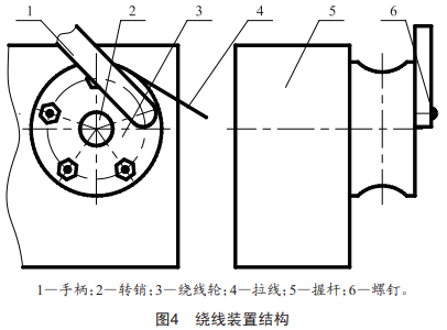 繞線輪(3)通過轉(zhuǎn)銷(2)安裝在握桿(5)上,并可繞轉(zhuǎn)銷(2)進(jìn)行正反轉(zhuǎn)動(dòng)以實(shí)現(xiàn)拉線(4)的收放。與繞線輪(3)配合的手柄(1)長150mm,寬與厚均為15mm,一端鑄出與繞線輪(3)上的六邊形不通孔配合的六邊形柱,柱中心加工出直徑4mm的通孔,以通過M3的螺釘緊固在繞線輪(3)上。
