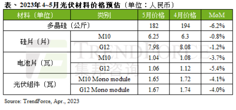 光伏組件方面,盡管上游硅料價格降至每公斤200人民幣以內(nèi),但成本下降帶來的利潤空間多被截流在硅片和電池片環(huán)節(jié),故光伏組件價格暫時尚未明顯下滑,實際成交價仍維持在每瓦約1.75人民幣。但從近期招標項目的光伏組件報價來看,部分廠商為了銷售而低價搶單,故基本都已降至每瓦1.7人民幣以下,TrendForce集邦咨詢預計至第三季光伏組件價格才會全線回歸正常區(qū)間,每瓦約1.6人民幣。