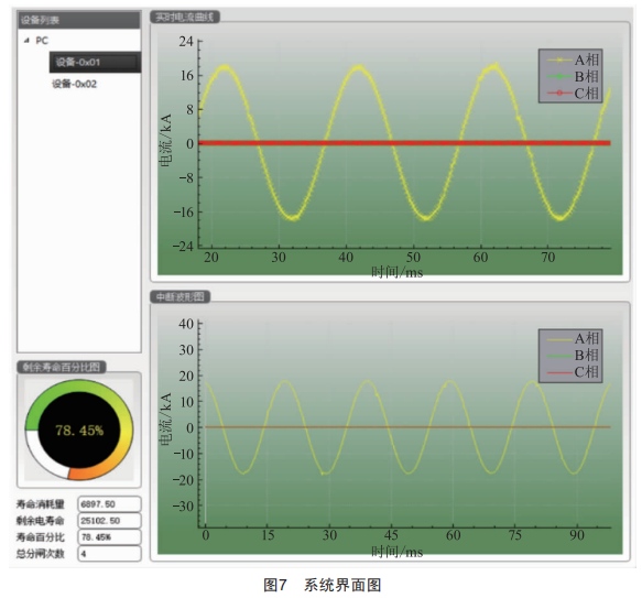 真空斷路器壽命監(jiān)測預警系統(tǒng)由傳感器、采集器、合并單元及后臺預警軟件組成,如圖4所示,可實時在線監(jiān)測斷路器開斷及關(guān)合瞬時電流值,結(jié)合預警系統(tǒng)軟件算法實現(xiàn)對高壓斷路器開斷次數(shù)及電壽命的實時在線監(jiān)測:控制和數(shù)據(jù)處理中心作為后臺軟件,是斷路器電壽命計算及人機交互的中心。軟件實時監(jiān)控真空斷路器,收集監(jiān)測斷路器處大電流,實時計算電壽命的損耗,將計算結(jié)果儲存在數(shù)據(jù)庫,具備多種方式的預警和查詢功能。