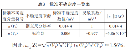 不確定度分別來源于鋼直尺分辨率u(Vi)和標(biāo)準(zhǔn)器u(Vo),其具體數(shù)值及靈敏系數(shù)如表3所示。