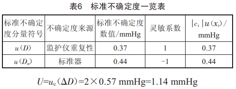 不確定度分別來源于監(jiān)護(hù)儀重復(fù)性u(píng)(D)和標(biāo)準(zhǔn)器u(Do),其具體數(shù)值及靈敏系數(shù)如表6所示。