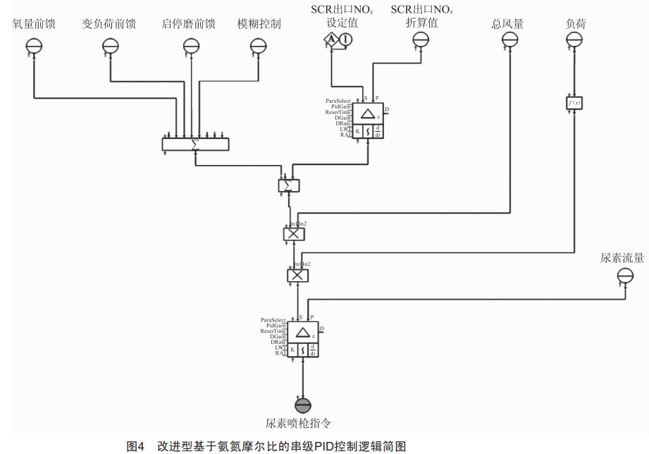 基于氨氮摩爾比的串級PlD脫硝控制,主調(diào)PlD控制回路設(shè)定值為SCR出口氮氧化物濃度控制目標(biāo)值,過程值為SCR出口氮氧化物實(shí)際值:副調(diào)PlD控制回路設(shè)定值為尿素溶液需求量,過程值為實(shí)際尿素溶液流量。