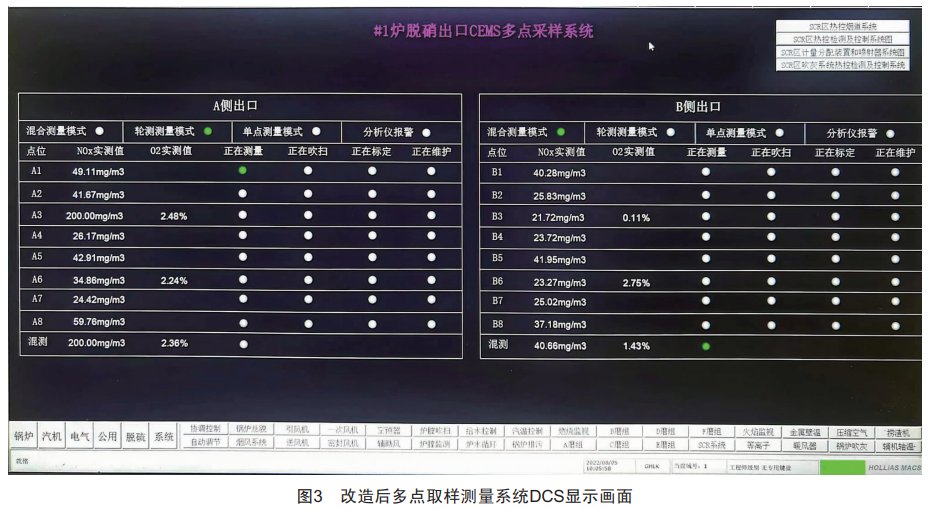 該多點(diǎn)取樣測量系統(tǒng)有3種工作模式:單點(diǎn)測量模式、混合測量模式和輪測測量模式。(1)單點(diǎn)測量模式工作時(shí),CEMs分析儀連續(xù)對設(shè)定的某一取樣口煙氣進(jìn)行測量,其他7個(gè)取樣口的煙氣不進(jìn)行測量。運(yùn)行過程中可根據(jù)實(shí)際情況選擇一個(gè)能良好表征反應(yīng)器出口氮氧化物濃度的取樣口進(jìn)行持續(xù)測量。(2)混合測量模式工作時(shí),CEMs分析儀將8個(gè)取樣口抽取的煙氣混合后進(jìn)行測量。(3)輪測測量模式工作時(shí),CEMs分析儀對8個(gè)取樣口抽取的煙氣依次進(jìn)行測量,此時(shí)可根據(jù)各取樣口煙氣氮氧化物濃度對各噴氨格柵支管手動閥進(jìn)行調(diào)整,將各取樣口抽取的煙氣中氮氧化物濃度調(diào)節(jié)至一定偏差范圍內(nèi),從而使反應(yīng)器內(nèi)噴氨較為均勻,提高脫硝效率,降低氨耗。圖3所示為改造后多點(diǎn)取樣測量系統(tǒng)DCS顯示畫面。
