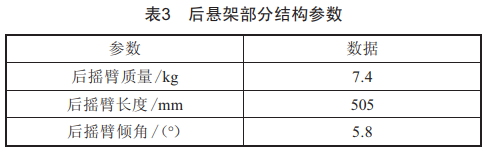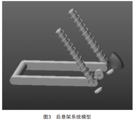 摩托車的后懸架系統(tǒng)模型對(duì)整車模型而言也相當(dāng)重要 ,摩托車在行駛過程中 ,后懸架系統(tǒng)直接影響車輛的乘坐舒適性。本文采用搖臂式雙減震器后懸架系統(tǒng) ,其部分結(jié)構(gòu)參數(shù)如表3所示 ,針對(duì)現(xiàn)有的模型參數(shù) ,建立的后懸架系統(tǒng)模型如圖3所示。