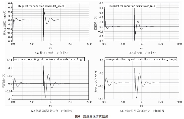 由圖6可知 ,雖然車輛需要經(jīng)過4 s才能趨于平穩(wěn)行駛狀態(tài) ,但由于車輛在受到l0 N·m的瞬態(tài)力矩時(shí) ,橫向加速度、橫擺角速度、駕駛員所需轉(zhuǎn)向角以及駕駛員所需轉(zhuǎn)向力矩幅值較小 , 由此判定該車型在高速直線行駛中受到脈沖干擾時(shí)穩(wěn)定性較好。