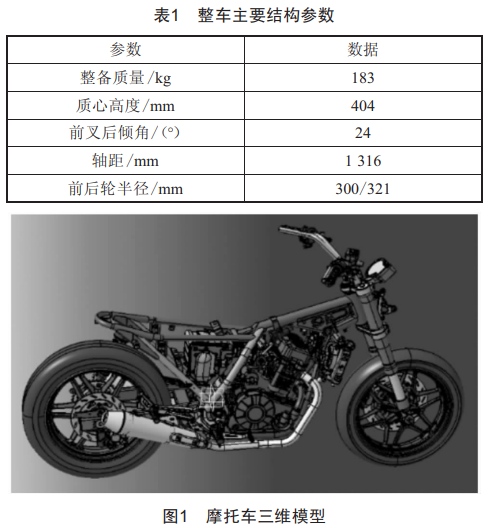 摩托車整車模型是建模最重要的部分之一 ,模型數(shù)據(jù)來源于某國(guó)產(chǎn)大排量摩托車 ,整車主要結(jié)構(gòu)參數(shù)與三維模型分別如表1和圖1所示。