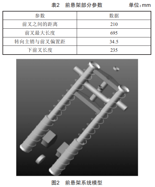 摩托車的前懸架系統(tǒng)模型是整車模型最重要的系統(tǒng)模型之一 ,其結(jié)構(gòu)形式的不同會(huì)導(dǎo)致動(dòng)力學(xué)性能的不同。本文前懸架由上下前叉組成 ,其部分結(jié)構(gòu)參數(shù)如表2所示 ,輸入相應(yīng)的模型參數(shù) ,完成如圖2所示的前懸架系統(tǒng)模型。