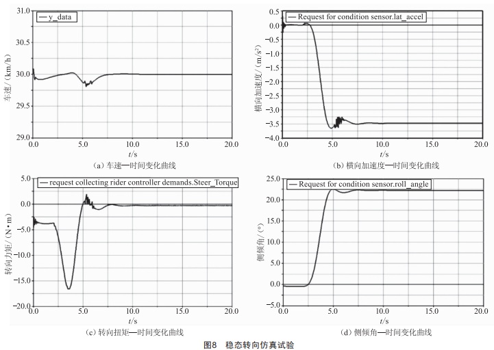 穩(wěn)態(tài)轉(zhuǎn)向的仿真試驗(yàn)結(jié)果如圖8所示,車速w=30km/h,轉(zhuǎn)向扭矩T=-0.4 N·m,側(cè)傾角。=223≈0.384 rad。