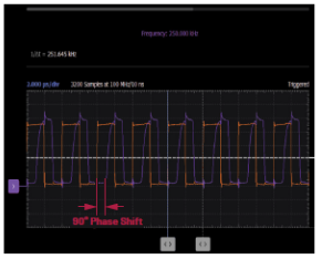 開啟固定5 V電源,并將9 V電池連接到電路。將AWG1輸出連接到FREF,如圖4所示。將AWG1配置為方波,其幅度為5 V峰峰值,偏置為2.5 V(0 V至5 V擺幅);將初始頻率設(shè)置為第1步中測得的值(即VIN設(shè)置為2.5 V時,應(yīng)在250 kHz左右)。將示波器通道輸入CH1+連接到FREF輸入,并將示波器通道CH2+連接到VSQR輸出,如圖6所示。還應(yīng)該將CH1-和CH2-輸入接地。將示波器設(shè)置為在通道1(FREF信號)的上升沿觸發(fā)。