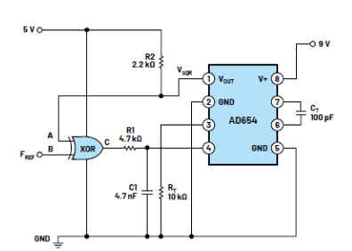 在FREF的頻率設(shè)為對應(yīng)于AD654引腳4上2.5 V控制電壓的情況下,VSQR處看到的輸出頻率應(yīng)鎖定輸入基準頻率FREF。在示波器屏幕上,您應(yīng)該看到兩個方波是穩(wěn)定的(即彼此鎖定),并且VSQR相對于FREF偏移約90°。請記住,當XOR鑒相器的兩個輸入相差90°時,其濾波輸出將處于其輸出范圍的一半或約2.5 V。