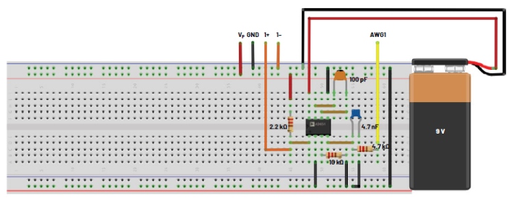開啟固定5 V電源,并將9 V電池連接到電路。將AWG1輸出連接到VIN,如圖2所示。將AWG1配置為DC源,初始設(shè)置為2.5 V。將示波器通道輸入CH1+連接到VSQR輸出,如圖2所示。還應(yīng)將CH1-輸入接地。