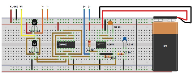 接下來,在試驗板上添加來自上一個實驗的異或門鑒相器電路,如圖5所示。構(gòu)建異或門后,將其連接到V轉(zhuǎn)F電路,如圖6所示,以構(gòu)成完整的PLL。在給電路添加任何東西之前,務(wù)必關(guān)閉5 V電源并斷開9 V電池。
