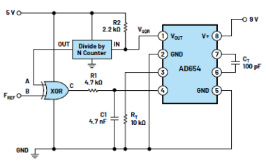圖6中的簡單PLL電路不是十分有意義,因為輸出信號只是輸入信號的相移版本。如圖1所示,如果在從VFC輸出端到鑒相器輸入端的反饋路徑中插入一個數(shù)字分頻器模塊,則輸出信號將是一個更高的倍頻信號。使用任何可用的數(shù)字分頻器IC,如CD4020、CD4040、CD4060甚至SN7490(幾乎任何分頻器IC都可以),斷開與異或輸入A的連接,并插入分頻器模塊,如圖9所示。