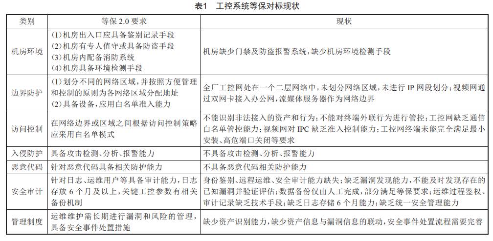 (4)工控系統(tǒng)等保對標(biāo)現(xiàn)狀如表1所示。