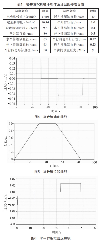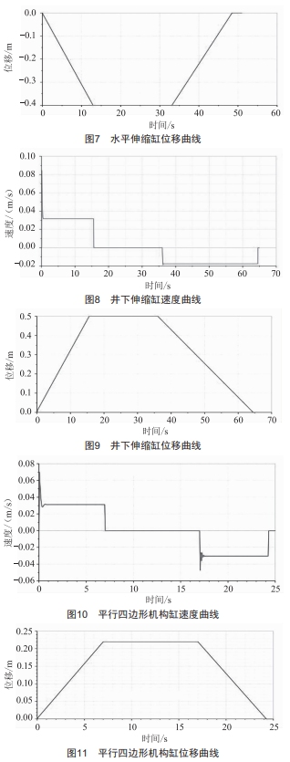 液壓系統(tǒng)執(zhí)行元件整體位移曲線如圖14所示。機(jī)械手動(dòng)作順序如下:首先舉升缸運(yùn)動(dòng),達(dá)到指定高度后處于中位保壓狀態(tài):然后水平缸運(yùn)動(dòng),達(dá)到指定位置后處于中位保壓狀態(tài):接下來井下伸縮缸進(jìn)入井內(nèi),平行四邊形機(jī)構(gòu)定位,抓斗抓取,井下伸縮缸退回抓斗松開,卸掉垃圾:最后水平缸和舉升缸退回完成一次抓取。