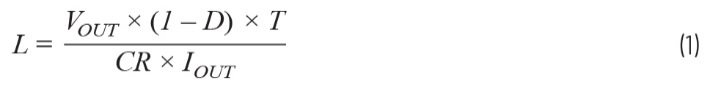 此公式基于電流紋波比CR計算降壓轉(zhuǎn)換器所需的電感值L。該比值一般指定為0.3,或30%峰峰紋波。在該公式中,D表示占空比,T表示周期時間,取決于各自的開關(guān)頻率。