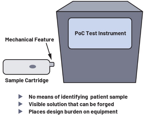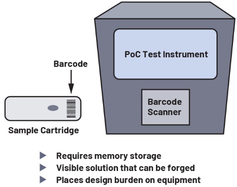 傳統(tǒng)上有兩種方法用于確?;颊邩颖镜恼鎸?shí)性。一種方法為加貼標(biāo)簽,例如一維和二維條形碼。第二種方法為利用可防止檢測(cè)盒重新安裝的機(jī)械特性。在實(shí)驗(yàn)室環(huán)境下,一維和二維條形碼是跟蹤樣本的首選方法。批次信息、序列號(hào)和設(shè)備唯一標(biāo)識(shí)可用于確保檢測(cè)盒的真實(shí)性。此外,可以在樣本處理之前查看條形碼,以確保未重復(fù)使用。盡管條形碼是確?;颊邩颖菊鎸?shí)性的可靠方法,但其也存在局限性。首先,條形碼標(biāo)簽需要條形碼掃描器,而由于尺寸和焦距要求,這會(huì)對(duì)儀器設(shè)計(jì)造成負(fù)擔(dān)。條形碼還需要較大內(nèi)存以存儲(chǔ)足夠數(shù)量的序列號(hào),以防止重復(fù)使用。盡管在大型實(shí)驗(yàn)室設(shè)備中這可能不會(huì)構(gòu)成問題,但對(duì)于緊湊型PoC設(shè)備而言,這將意味著成本和尺寸挑戰(zhàn)。更重要的是,由于用戶可以看見條形碼,因此條形碼就沒有那么安全,且易被復(fù)制或偽造。