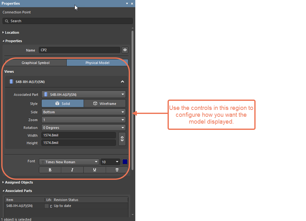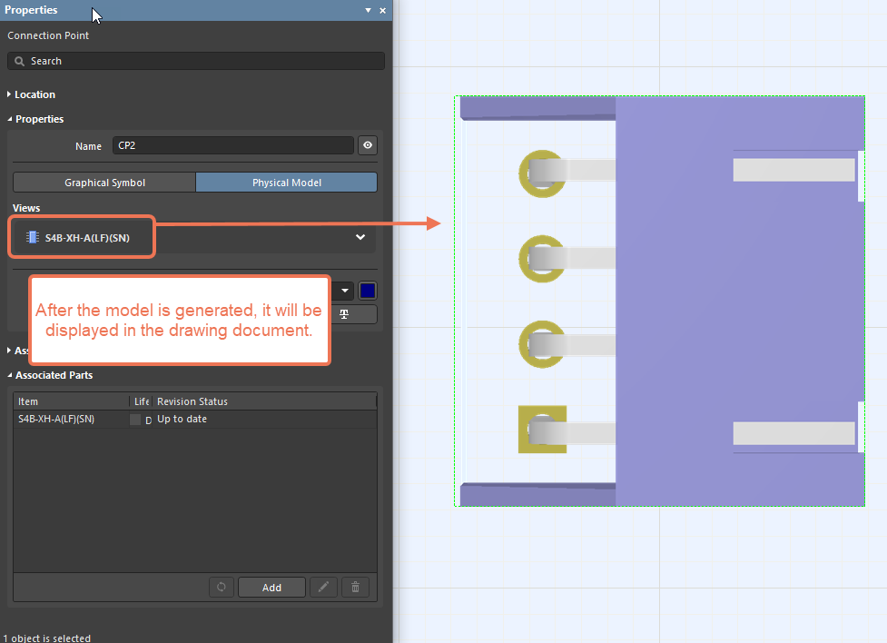 在當(dāng)前版本中,可以顯示連接點關(guān)聯(lián)部件的3D模型。在Properties面板的Connection Point模式下,選定Properties區(qū)域中的Physical Model,然后使用Views區(qū)域中的Associated Part下拉列表選定所需關(guān)聯(lián)部件。將生成并在Layout Drawing中顯示模型。使用Views區(qū)域中的選項,對模型顯示進(jìn)行配置。