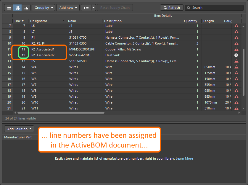 在Harness Manufacturing Drawing中,與連接器或連接點關(guān)聯(lián)的圖注此時將顯示其關(guān)聯(lián)部件的所有BOM條目位置編號。以下示例所示為連接器關(guān)聯(lián)部件的BOM條目位置編號。