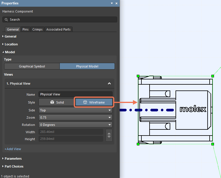 為了更加精確地顯示3D模型,在Properties面板的Harness Component模式中添加了新Style控件。您此時可以選擇將模型顯示為線框視圖(Wireframe),或者顯示為以不帶線(Solid)的陰影圖。Style控件位于面板Views項下的Model區(qū)域。