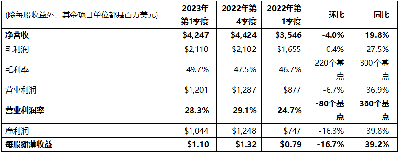 ?第一季度凈營收42.5億美元; 毛利率49.7%;營業(yè)利潤率28.3%; 凈利潤10.4億美元