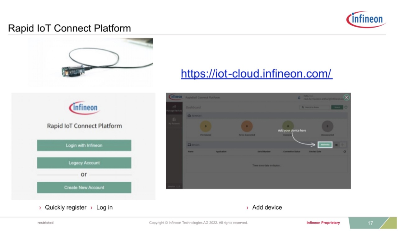 CSK提供給開發(fā)者的是一種 “快速搭建、快速上手” 的體驗,只需要登陸一個賬戶,注冊CSK硬件,就可以自動下載參考代碼,在云平臺界面上看到雷達和CO2的數(shù)據(jù)。英飛凌提供了一個名為Rapid IoT Connect Platform的平臺,通過該平臺,開發(fā)者可以快速將CSK連接到云端,將傳感器數(shù)據(jù)上傳到云端,在云端的界面內(nèi)可以看到全部的傳感器參數(shù)。