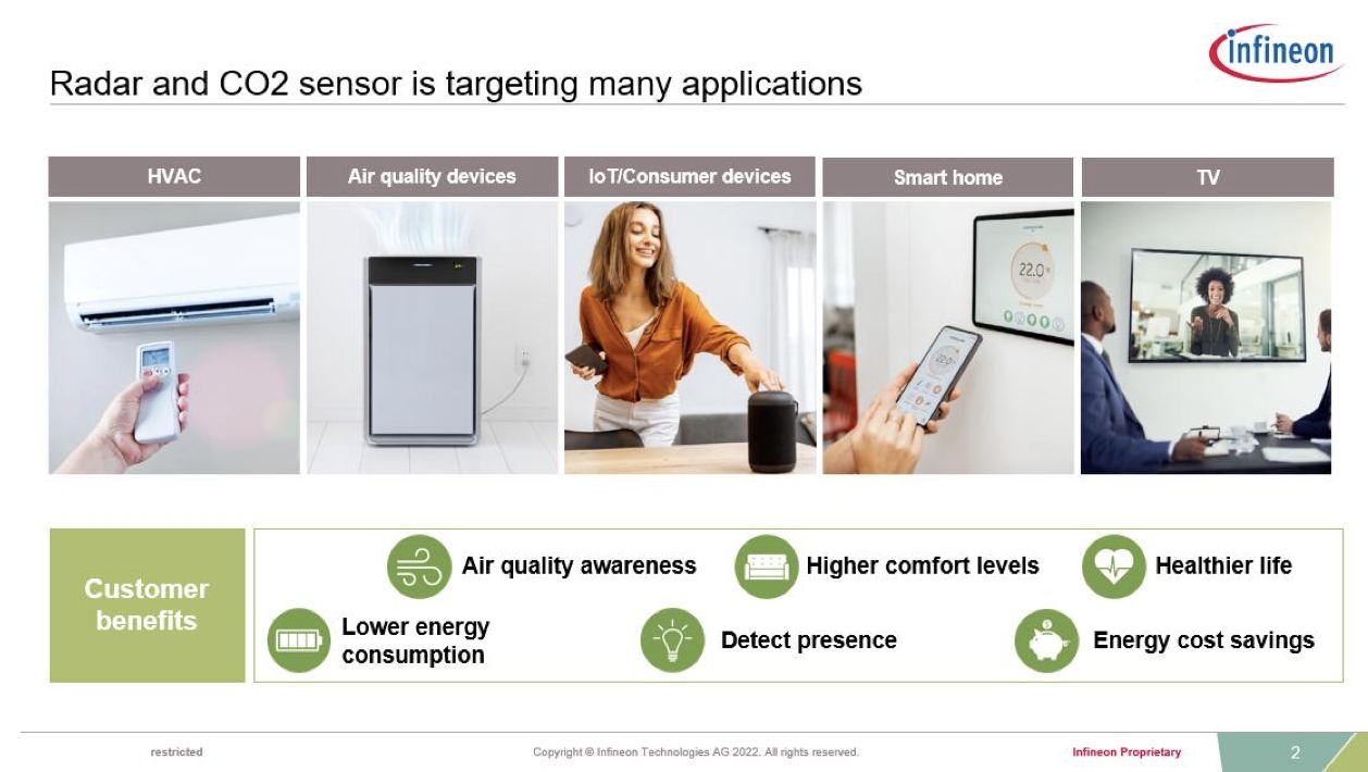 而要實現(xiàn)對于人的信息狀態(tài)的精準(zhǔn)感知和捕獲,同時還要確保個人隱私,雷達傳感器和CO2傳感器就成為了非常合適的選擇。傳統(tǒng)的被動性紅外檢測等技術(shù)并不能更精準(zhǔn)地判斷人的軌跡和密度。而雷達可以發(fā)揮清點人數(shù)或了解人員密度的功能,當(dāng)感知到房間里人多的時候,就可以把空調(diào)溫度調(diào)低一點。單純通過CO2傳感器,也可以偵測到會議室、睡房、客廳等房間里人的密度,若二氧化碳濃度變高,就可以自動調(diào)節(jié)空調(diào)、風(fēng)扇等設(shè)備。