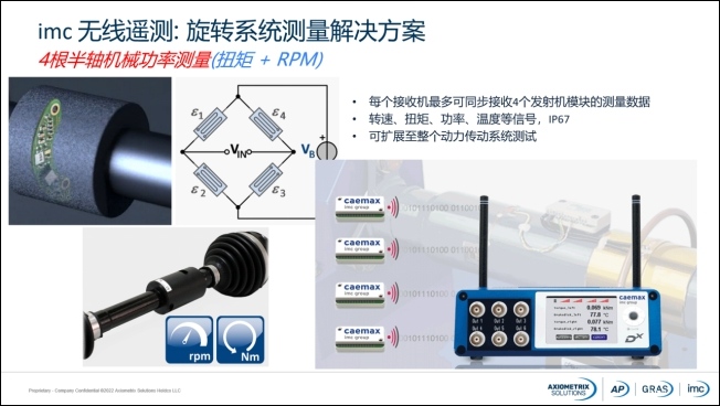 汽車傳動系統(tǒng)本質(zhì)上是將化學(xué)能(燃油車),電能(電動車)轉(zhuǎn)化為車輪上的扭矩,無論是產(chǎn)品研發(fā),還是性能測試,都需要精確獲得飛輪,電機軸、半軸以及車輪上的扭矩,轉(zhuǎn)速或其它信號。例如:電動汽車由電機直接驅(qū)動半軸到車輪,對比傳統(tǒng)燃油車,半軸承載扭矩的變化速度和幅值都更快,更大,乃至更危險。德國imc測試測量采用先進的無線遙測技術(shù),可應(yīng)用在電動汽車能量流測試(機械功率精準測試)、電動汽車能量回收測試、燃油車飛輪測試等測試場景。