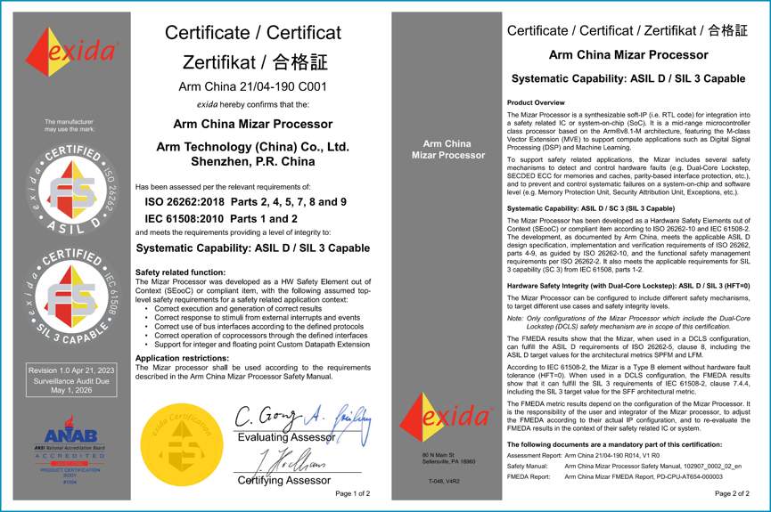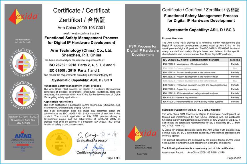 exida首席安全專家兼首席運營官Alexander Griessing 表示:“exida為半導體、汽車和自動化行業(yè)提供業(yè)界最嚴謹、以技術(shù)價值為導向的安全評估和認證方案,旨在幫助客戶實現(xiàn)安全落地后的產(chǎn)品技術(shù)領(lǐng)先性。祝賀安謀科技通過ISO 26262 / IEC 61508功能安全評估,分別成功獲得數(shù)字IP硬件開發(fā)流程認證和處理器內(nèi)核產(chǎn)品認證。隨著ADAS和自動駕駛、機器人、工業(yè)4.0等安全關(guān)鍵應用的迅速發(fā)展,市場對更強大、更復雜的片上系統(tǒng)(SoC)解決方案的需求不斷增長。安謀科技作為芯片供應鏈上游的核心企業(yè),在提供IC開發(fā)人員所依賴的底層核心技術(shù)方面發(fā)揮著關(guān)鍵作用。此次獲頒認證更充分證明了安謀科技在汽車及工業(yè)安全方面優(yōu)秀的研發(fā)水準與技術(shù)實力,同時也為其IP系列產(chǎn)品的持續(xù)功能安全符合性提供了可靠保障?!?